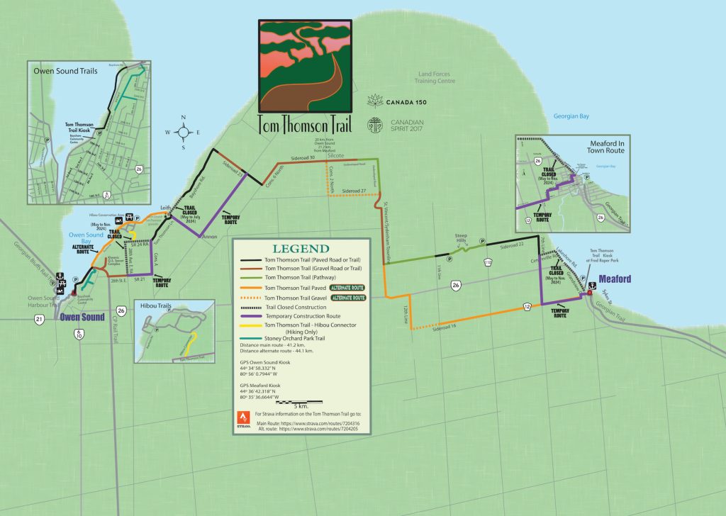 There are 3 construction projects in the municipality of Meaford this summer that cyclists should be aware of. They also happen to be on sections of the Tom Thomson Trail. (See map) One is on 24 Side Road just of Tom Thomson Lane. The bridge is been replaced. Trail closed from May to Nov. The 2nd one is in the Village of Leith. Princess St. (Bayshore Rd.) is being re-built from the corner in Leith to the bridge at Ainslie Wood. Road closed May to July. The 3rd is in the Town of Meaford, where Lakeshore Street South is being re-paved. Road closed May to Nov.