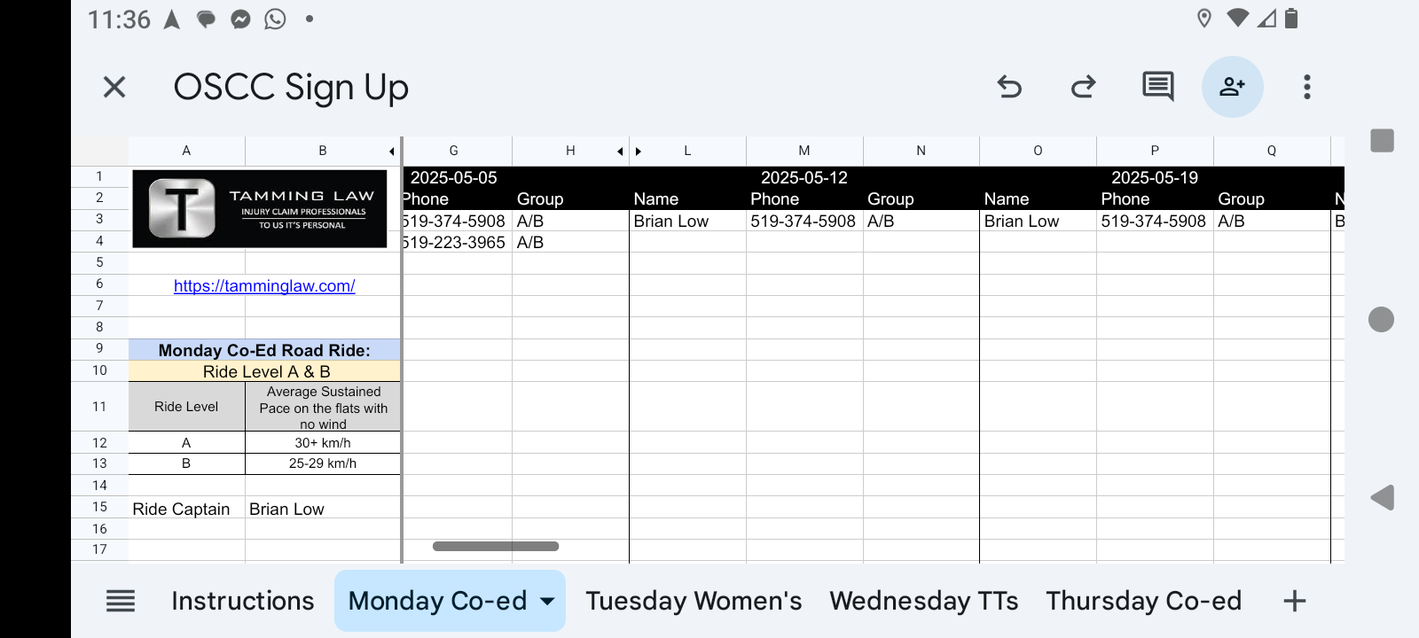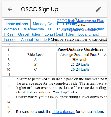If you see a jumbled display with overlapping sheets. And you can’t edit the sheet to add your name. And/or you’re taken to the Instructions sheet instead of the ride sheet for your chosen ride. This usually means that you don’t have Google Sheets installed on your device, and the sheets are being displayed by your browser causing the funky display issues similar to what you see below.